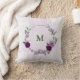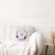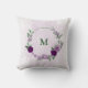 Bella almohada romántica con flores púrpuras y algunas hojas verdes.