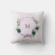 Hermosa almohada romántica con flores verdes esmeralda y púrpura y algunas hojas.