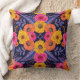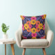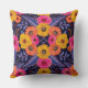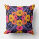 Esta almohada de tiro cuadrado tiene flores y hojas en tonos saturados de amarillo, naranja, púrpura y rosa caliente rodeados de contornos rojos.