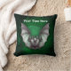 This throw pillow has a grey bat with wings spread flying from a spooky misty glowing green cave with barren trees. Customise your text with the template on the front and back.