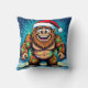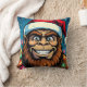 A funny Sasquatch Christmas throw pillow with a comic book style pop art sasquatch smiling with a Santa and Christmas lights on.
