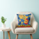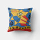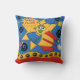 Graciosa almohada de Space Alien, genial para los niños que aman los barcos de cohetes y el espacio exterior! Un barco con cohetes rojos, amarillos y azules, con un alienígena de ojos grandes y verdes en los mandos, estrellas y remolinos en un fondo azul con una gran estrella amarilla y un globo azul.