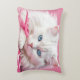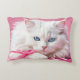 Hermoso gato blanco con ojos azules y cintas rosadas enredadas en rosa.