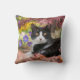 Cute cat, tuxedo patrón bicolor blanco y negro, Shorthair europeo, descansando bajo un arce japonés en un jardín florido y con curiosidad. Foto tomada por Katho Menden. Esta almohada es un regalo para los amantes del gato.