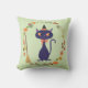 Un gato negro mágico lleva un sombrero de bruja puntiagudo rodeado de flores de otoño y escoba. Delicadamente colocado contra un fondo verde menta. Ilustración original de Noël Snow