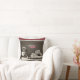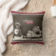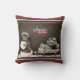 Fotografía navideña vintage con un gato super lindo vestido con un vestido de vacaciones con la mano caliente. El gato está tirando un trineo de regalos envueltos. Mensaje: Saludos de temporada. Esta almohada tiene un color sólido reversible de la espalda roja oscura.