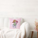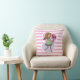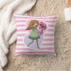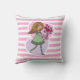 Cute pink and white stripped pillow / cushion featuring a whimsical girl with long flowing yellow hair and wearing a green dress and stripped stockings. She is holding a beautiful bunch of red roses in her outstretched arms. The background is made up of a pink and purple love heart.