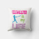La almohada de tiro colorida del softball con el texto, "softball es mi vida". Tiene una silueta femenina del jugador de softball. ©gollygirls.com