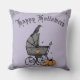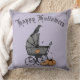 Dibujada a mano con tinta negra, esta almohada gótica festiva "Happy Halloween" presenta ilustraciones dibujados a mano con tinta negra por Nathalie Portet de un antiguo coche victoriano para bebés, cuervo negro, calabazas y telarañas, todo con un elegante fondo morado. Con texto editable, personalizar tu almohada en la página del producto haciendo clic en "Personalizar esta plantilla" antes de añadir a tu carrito.