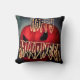 Este dibujo gráfico, editado digitalmente, para realzar, este vibrante, naranja y negro, calabaza, con amenazante, sonriente, hacia la derecha, contra un fondo azul-gris, con Happy Halloween, Emblazonado, al otro lado del frente, con letras macabras, de color pálido.