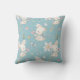 Un adorable conejo blanco sostiene una flor rosa en el patrón de esta almohada de guardería para bebé. Cerca de la parte inferior hay una oval con el nombre del bebé y la fecha de nacimiento. Todo está colocado sobre un fondo azul medio. La parte posterior de la almohada tiene el mismo patrón sin la oval o texto. ¡Un regalo adorable para un baby shower!