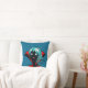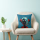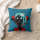 almohada de chica de vampiros con un ilustracion digital de un gracioso personaje de piel oscura sin muerte con ojos brillantes, pelo azul, fans y una capa roja vibrante sobre fondo azul oscuro. Diseño divertido para Halloween.