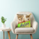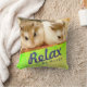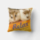 almohada divertida y linda de hamster. Ilustrado con un adorable hámster robot marrón y blanco. Tiene una nariz rosa linda y bigotes blancos largos. La almohada tiene un mensaje para "Relájate y sé feliz". Los colores naranja y geométricos verdes le dan a la almohada un aspecto más luminoso.