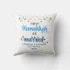 Almohada para tirar Hanuká POR PRIMERA VEZ CASADOS con NOMBRES Y AÑO personalizables. El diseño muestra tipografía de escritura a mano azul de Hanuká con estrellas colgantes azules y amarillas. Dos estrellas rojas decoran la palabra 'casados'. Un hermoso recuerdo para parejas que celebran su primer Hanuká casados. El diseño se repite en la parte posterior.