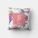 Frente: Un sello de monograma. Enmarcado en el centro va la primera letra de tu nombre en blanco sobre rosa claro, con tu nombre debajo en un tamaño mucho más pequeño. Todas las letras son cursivas. El fondo de la almohada, tanto delante como detrás: varias flores coloridas diferentes. Las flores están dibujadas a mano de Etsy Watercolor Stock.