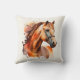 Una almohada con un hermoso ilustracion. Cabeza de caballo de color castaño de cobre y cuerpo superior. Con parches de acuarela detrás.