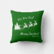 Añada un toque divertido de temporada a su casa con esta almohada personalizado de tiro verde y blanco. La almohada de cristal presenta fondo verde con el saludo blanco de Feliz Navidad y el texto de Ho Ho Ho Ho, tu apellido familiar y Santa Claus volando en su trineo con renos. Esta almohada de tiro también hace un gran cumpleaños personalizado, ducha de novia, boda, Navidades u otro regalo de vacaciones.
