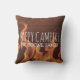 El regalo rústico personalizado perfecto de la decoración para los rvers, los caminantes, los campistas, y los tipos outdoorsy es esta almohada rústica linda del tema que acampa. Lee los campistas contentos en manuscrito, todas las letras blancas capitales. Por debajo es el nombre personalizado de la familia o de cualquier texto de encargo que usted tenga gusto en letras caprichosas, blancas. Contra fondo de la hoguera de un primer de un fuego y de una madera ardientes. Regalo lindo del retiro, también.