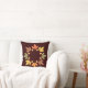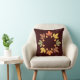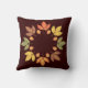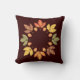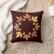 Hojas de arce amarillas, naranjas, marrones y verdes dispuestas en círculo con bellotas sobre fondo marrón profundo.