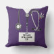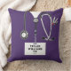 Una almohada creativa de enfermera con matorrales morados de hospital, un estetoscopio y un cuchillo del ejército suizo. Editar texto para agregar nombre y credenciales profesionales.