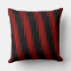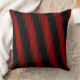 Esta ilustración de almohadas de lanzamiento cuadrado incorpora formas diagonales en una variedad de tonos rojos claros y oscuros, así como una superposición vertical de rayas negras sobre un lienzo negro rico.