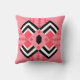 Esta almohada de tiro tiene un diseño Art Decó inspirado en el tejido de diamante en forma de colcha en blanco, negro y rosa sobre un campo de sandía.