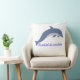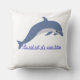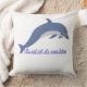 El elemento central es un delfín estilizado representado con un patrón que recuerda al arte, está saltando o nadando sobre un conjunto de olas vibrantes. Los colores predominantes son el azul turquesa, el azul marino oscuro y toques de blanco o un color de contraste, que destacan sobre el tela de otro color a crema, lino o blanco roto del cojín.