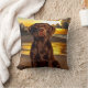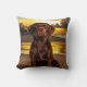 Un recuperador de chocolate se sienta en una playa de arena, mirando atentamente a la cámara. La piel del perro es un marrón rico, que contrasta con los tonos dorados del sol poniente. El cielo está en llamas con vibrantes nubes naranjas y rosas que reflejan la arena mojada. Las olas del océano se abalanzan suavemente en la orilla, creando un ambiente tranquilo y sereno. Un regalo ideal para los amantes del labrador.