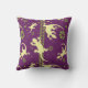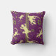 Elegante cojín violeta y verde, impreso con un moderno patrón de gecko. El patrón incluye geckos crema, detalles étnicos sabrosos y verdes, en un cálido fondo violeta.