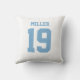 Add a name and number(s) to personalize this custom double-sided light blue and white sports jersey inspired accent pillow. It is an excellent gift for a sports fan or athlete. The options to change the color and font sizes are available.