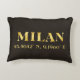 El diseño de almohadas de acento lux presenta la ciudad de Milán, las coordenadas de mapa de latitud y longitud de Italia en fuentes doradas sobre fondo negro.