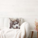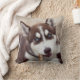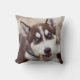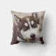 Marrón cachorro siberiano y blanco con ojos azules comiendo palos de madera en la playa.