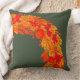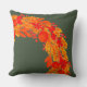 Moda y vacaciones elegantes arrojan almohada. Ilustracion de invierno luminoso con una corona decorativa de ramas de abeto, hojas, bayas y naranjas sobre fondo verde.