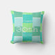 El diseño es encantador y sencillo, con colores de moda para primavera y verano (agua, turquesa y verde claro). Estas baldosas de colores se realizan con líneas rectas alternas y líneas irregulares como batik falso. Personalizable almohada de cumpleaños con letras blancas.