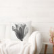 A close-up, monochrome photograph showcases a tulip flower against a bright white background. The flower's petals are delicately rendered, with visible veins adding texture. The image captures the flower from a low angle, emphasizing its upward reach. The stem is slender and dark, contrasting with the lighter petals. The overall mood is serene and elegant, highlighting the flower's natural beauty.