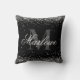 Elegante Purpurina plateado Monograma blanco y negro almohada de lanzamiento con un nombre de guión de caligrafía de personalizable y una plantilla de monograma en negrita. Una almohada acentuada adorable para un dormitorio de chicas o dormitorio universitario.