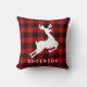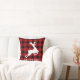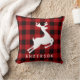 La almohada de acento de vacaciones cuadradas incluye un monograma de tu apellido (u otro texto) con un marco con estampado de búfalo de cuadros rojos y negros y silueta de reno blanco.