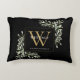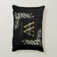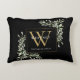 Elegante cojín de acento de monograma de greenery con acuarela con un monograma inicial dorado con su nombre puesto en texto blanco clásico sobre un fondo negro chic. Diseñado por Thisisnotme