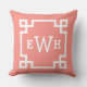 El diseño de almohadas de acento cuadrado moderno y elegante presenta un diseño de marco geométrico de borde griego y un monograma que se pueden personalizar. Naranja de coral / colores rosa y blanco. Se puede modificar el color de fondo.