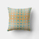 Esta almohada de tiro tiene un diseño geométrico de líneas en tonos verde azulados y naranjas tejidas para hacer una manta.