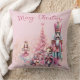 Esta almohada de lanzamiento personalizado presenta un tema de Navidades de hadas de desnudo rosado bonito sobre un fondo rosa suave. Personajes de la historia de Nutcracker se retratan alrededor de un árbol de Navidad de color rosa. La bailarina de las hadas de la Pluma de Azúcar aparece en la foto a la izquierda, y el gigante Nutcracker y Mouse King están retratados a la derecha. Un saludo de ejemplo "Feliz Navidad" se imprime encima del ilustracion que puedes personalizar para incluir tu propio saludo, nombre personalizado u otro texto.