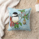 Chickadee lindo sentado en una rama de árbol en invierno con copos de nieve cayendo por todos lados. Los adornos navideños están colgando de la rama del árbol en la que está sentada la chica.