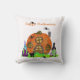La almohada de Fun Halloween incluye una casa grande de calabaza gnome y dos gnomos parados a ambos lados. También hay un gato negro y arañas negras. Dice Feliz Halloween en la cima. Este diseño se repite en ambos lados y también aparece en toda una colección de suministros de fiestas.