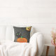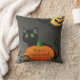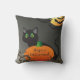 Una almohada de halloween con una escena espeluznante pero linda de un gato negro parado detrás de una calabaza bajo una luna llena. Los murciélagos están sobrevolando la cabeza de los gatos.