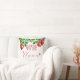 La parte posterior de la almohada tiene un fondo rojo y una inscripción en blanco.