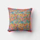 Un Cojín decorativo o Cushion con un patrón de flores rojas, naranjas y amarillas sobre un fondo turquesa brillante, de un collage de papel pintado a mano de Judy Adamson.