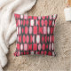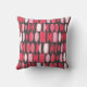Esta almohada de tiro tiene un diseño Art Deco de ovales y medias óvalos en blanco y tonos rosas sobre un campo de gris oscuro.