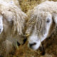 Dos hermosas ovejas de Cotswold capturadas fotográficamente en un momento gracioso y humorístico conversando. Los ovinos de algodón proceden de los Cotswolds de Inglaterra y son criados por su lana y su carne. Tienen pulgas largas con un matiz casi dorado.