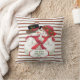 Este adorable diseño presenta un estilo vintage, un muñeco de nieve y una mujer con pañuelos rojos y gorras de vacaciones. El fondo se compone de rayas de caramelo rojas y blancas que se pueden personalizar. El texto de abajo dice: "NUESTRA PRIMERA NAVIDAD - 20XX" y puede ser personalizado. Este diseño está a ambos lados de la almohada.