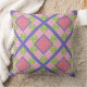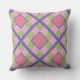 Cojín decorativo de moda o Cushion, con un patrón de bonito en imitación de cruz rosa profundo, azul violeta y amarillo sobre un frondoso fondo verde, con puntos de gingham y polka de color rosa y blanco profundo; de la colección "Primroses" de Posh & Painterly.
